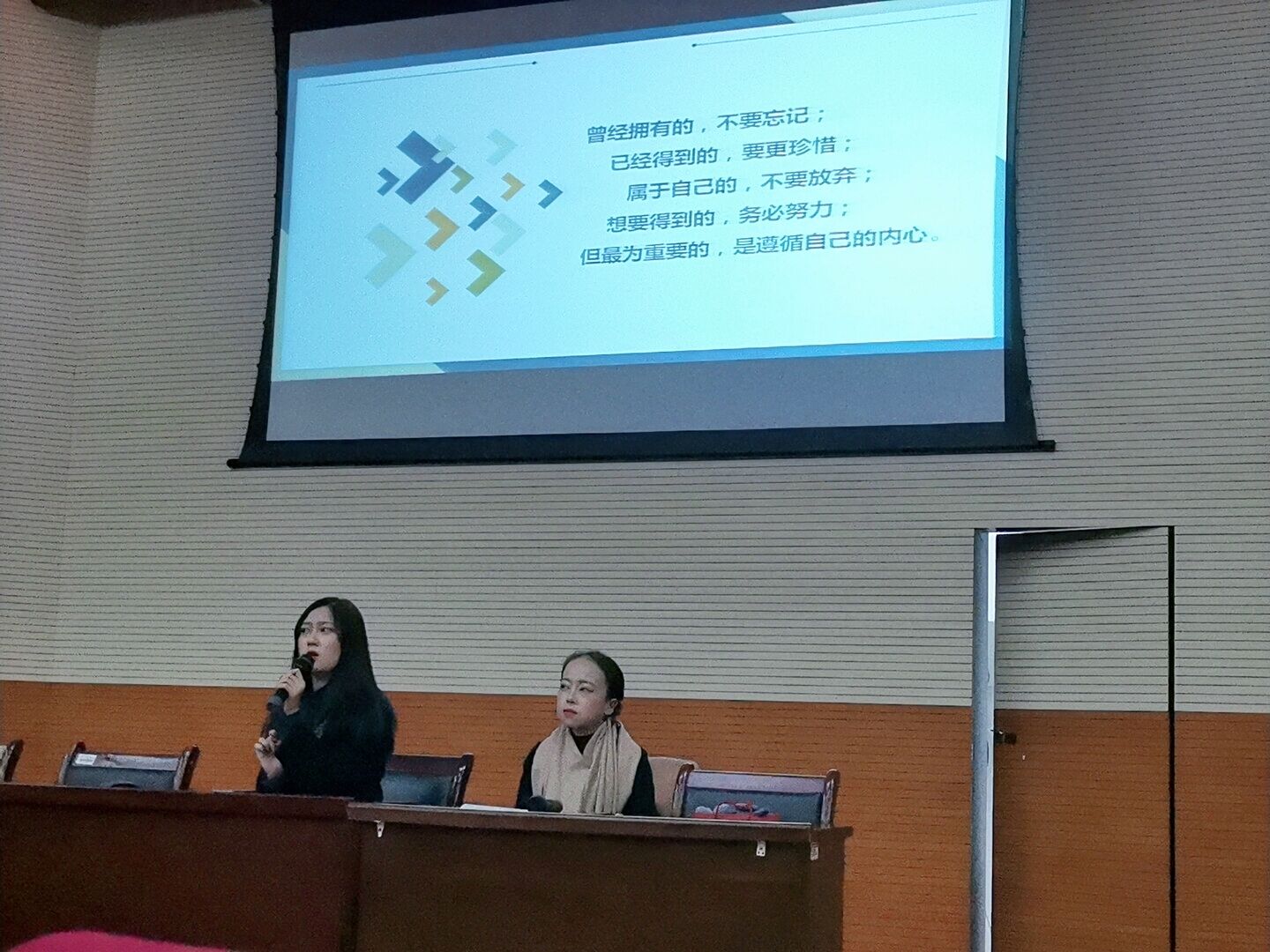 报告会期间,7位同学分别介绍并展示了自己大学生活的片段与经历,分享了学习技巧及心得。参军入伍两年的胡锦花学姐向同学们展示了她在军营中的生活与经历,告诫大一的新同学们要不断超越自己、挑战自己,行动是成功的一半;国馨予学姐分享了她口语练习的技巧及学习心得,希望同学们能认真思考,珍惜大学时光,做好规划;陆丹妮学姐也分享了自己的学习技巧,希望学弟学妹们拓宽眼界,勇敢做自己想做的事;王悦学姐建议同学们找到适合自己的学习方法,同时也分享了自己大学生活中的经验和教训;肖彩霞学姐认为20级的同学们应该积极参加活动,要锻炼自信、乐观、自强、奋进的精神,强调同学们应该学会感恩、热爱生活;焦裕洁学姐展示了自己大学生活的片段与经历,就如何在大学里“乘风破浪”做了演讲:一、重新认识自己;二、实现自我价值;三、保持拥有有趣的灵魂;管雅雯学姐以“冲未来,动现在”为主题,从自我认知、定位目标、生活感想3个方面,就“我是什么样的人”、“我想成为什么样的人”、“我怎样成为我想成为的那个人”3个层次告诫同学们要加强自我认知,合理规划生活,努力奋斗开发潜能,同时也要遵循自己的兴趣愿望。