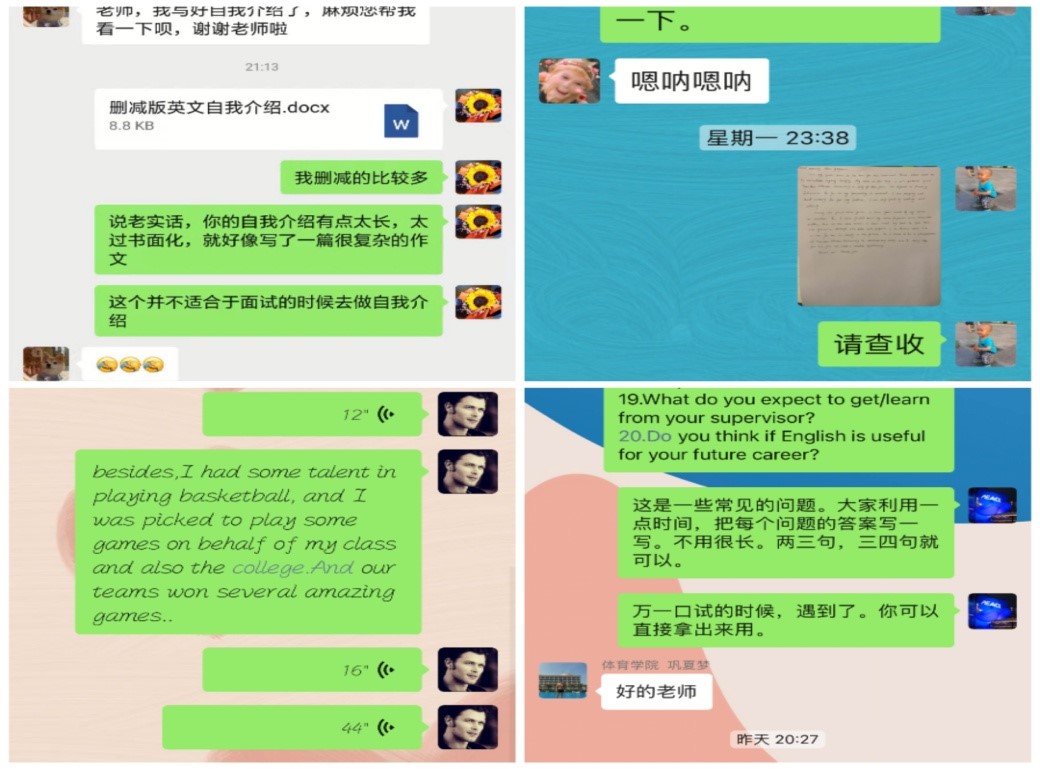 经过一周时间的摸底和统计后,工作人员将“求助”学生按照报考学校和专业,分配给每位指导教师。每位指导教师负责四名学生的培训和辅导工作,以便提升指导的精准度和有效性,切实提高学生英语口语和应变能力。重点帮助他们准备精彩的英文自我介绍,并且讨论预测面试范围,准备贴切的问题和恰当的回答,让同学们能够有的放矢,增强复试的自信心。特别针对疫情期间很多学校考研复试将采用线上形式进行的现实情况,指导教师组织学生连麦,进行在线模拟面试,以便于他们能够熟悉远程线上复试的流程,调整到最佳状态应对即将到来的复试。