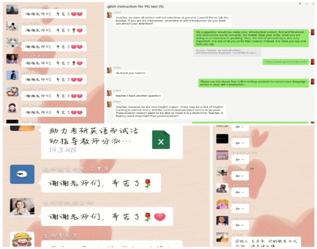 活动于3月14日正式启动。通过创建“助力考研英语面试服务群”微信群,邀请我校考研上线进入复试环节的非英语专业学生入群,开展初步摸底工作,掌握所有需要帮助的学生的确切信息,以便能更精准有效地实施培训和辅导。同时,还专门安排人员在群里耐心为学生解疑答惑。活动得到了全校不同专业300余名学生的积极响应。