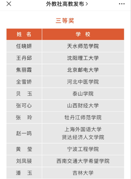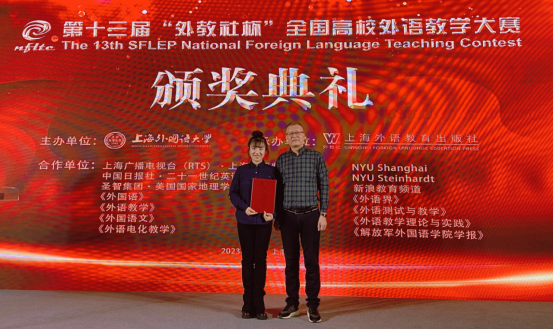 3月3日至5日,第十三届“外教社杯”全国高校外语教学大赛(大学英语组)全国总决赛在上海外国语大学举行。大赛分为综合课组和视听说课组,从全国30个赛区脱颖而出60位优秀选手同台竞技。经过激烈角逐,我院教师任晓妍,最终以决赛第十一名成绩获得本届大赛综合组三等奖,位列该奖项第一。
