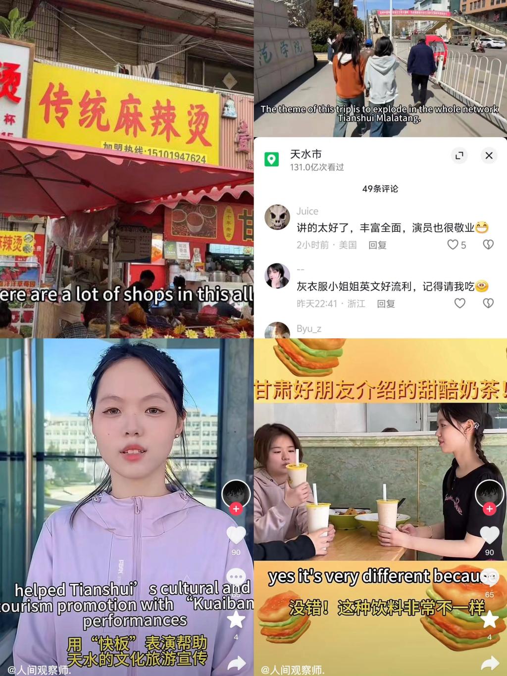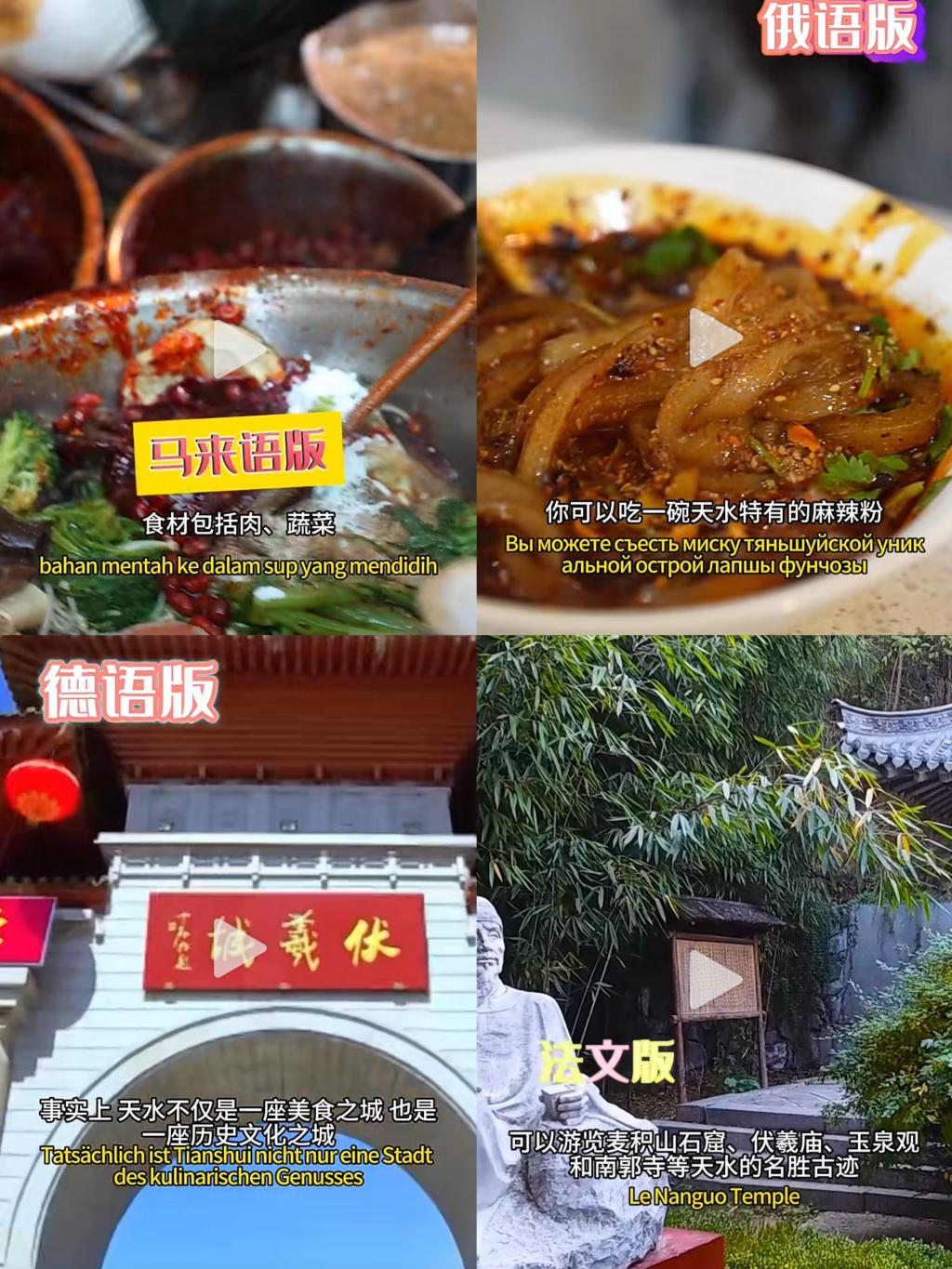 在地方特色文化外译层面,我院凭借专业优势,派出俄语、德语、马来语、法语等语种的教师,深度参与天水融媒体中心多语种麻辣烫宣传视频的录制,为海外观众,特别是非英语国家的观众打开了一扇了解天水文化的窗口。在创新实践教学层面,我院要求部分有经验的教师在教学中设立相关板块,指导学生拍摄英文短视频,向海外朋友生动展示天水特色美食。目前,任晓妍老师所指导的伏羲书院学生拍摄的麻辣烫英文短视频在抖音等社交平台播放量持续上涨,引发了众多网友的积极反响。