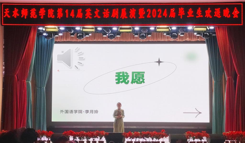 此外,学院还特别邀请了副院长张晖带来独唱《突然的自我》,将晚会氛围推向高潮,赢得了同学们热烈的掌声。23级商务英语1班的情景剧《追光者》生动地描绘了同学们在大学时光里的奋斗与追求,以及离别时的不舍。班主任和辅导员深情朗诵《有你的夏天》,字里行间流露出对毕业生们的关爱与不舍。同时学院领导及老师们通过VCR为毕业生们送上最真挚的祝福,希望他们能够在未来的道路上勇往直前,创造更加美好的未来,每一句真挚的话语都饱含着对毕业生们的深深祝福与殷切期望,让大家感受到了浓浓的关怀。晚会在李月玲老师的独唱《我愿》中落下帷幕,那饱含深情的歌声,表达了对2024届毕业生的美好祝愿。