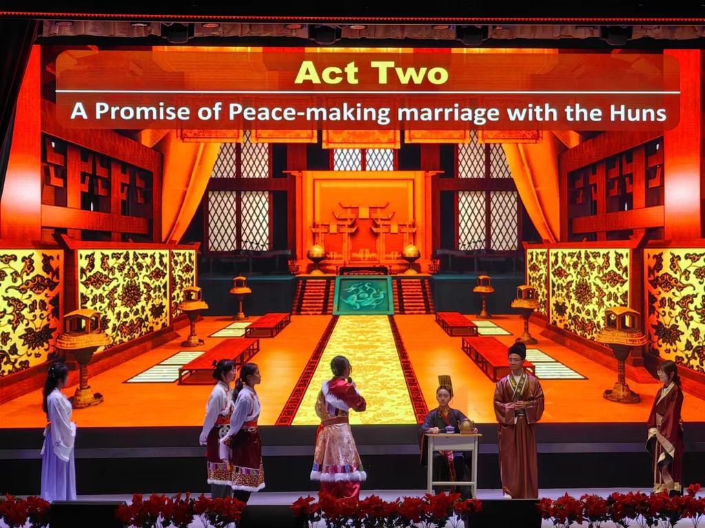 英文话剧《昭君出塞》生动地呈现了王昭君的传奇故事,22级英语1班同学们流利的英文和精湛的表演,展现出深厚的语言功底和对历史文化的独特诠释。22级英语2班的英文话剧《木叶情歌》让观众感受了苗族爱情故事的别样风情,演员们深情的演绎让观众仿佛置身古老的村落,与主人公同呼吸共命运。经典话剧《雷雨》配上22级英语3班同学们流利的英语台词,是经典作品的再一次震撼登场,演员们时而哭泣时而呼喊,将剧中人物的复杂情感展现得淋漓尽致,令人赞叹不已。22级商务英语1班的英文话剧《木兰从军》将木兰的英勇与坚毅在舞台上展现得熠熠生辉,生动诠释了外语人“用外语讲好中国故事”的初心与坚持。