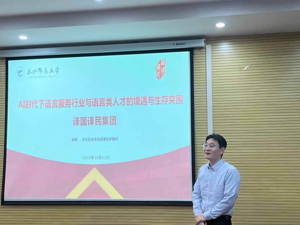 2025年10月23日下午3点,beat365邀请译国译民西安百思乐教育咨询有限公司技术顾问、译国译民西北地区商务经理杨瑾,在2教425教室作题为《AI时代下语言服务行业与语言人才的境遇与突围》的专题报告。学院部分教师、翻译专业研究生及本科生共80余人到场聆听,共同探讨AI浪潮下语言服务行业的发展与人才培养新路径。