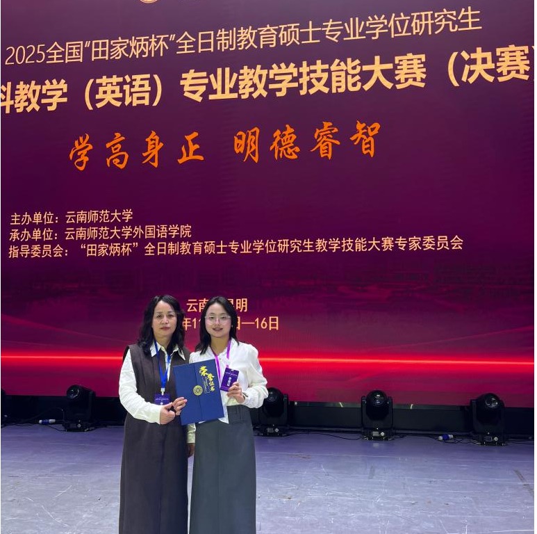 11月14-16日,2025年全国“田家炳杯”全日制教育硕士学科教学(英语)专业教学技能大赛决赛在云南师范大学举办。经多轮角逐,我校beat3652024级研究生张攀静凭借扎实功底、精巧设计与出色临场表现荣获二等奖,beat365教师郭晓英教授荣获“优秀指导教师”奖。